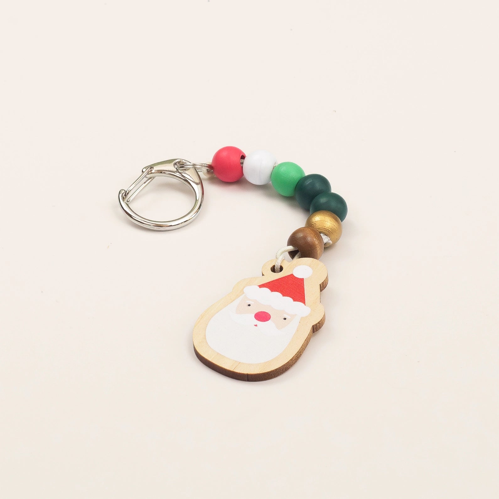 MATERIAL - wooden santa fob, spherical beads, keyring link, elastic with metal ends