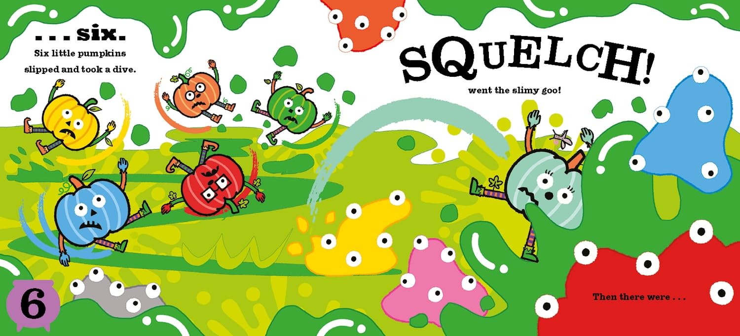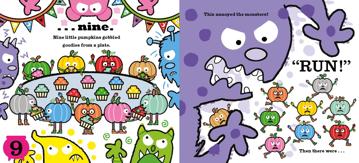 Ten little pumpkins are brought to life by magic dust on Halloween. Can they make their way past ghosts, ghouls and monsters to the Halloween party? Follow the pumpkins as they screech and squelch their way through a weird and wonderful world, packed with sweet and spooky friends. Read the bouncy rhyming story and count from ten to one and back again, as the little pumpkins disappear then reappear. Spot and count the details on each page, and join in with the read-aloud sounds.